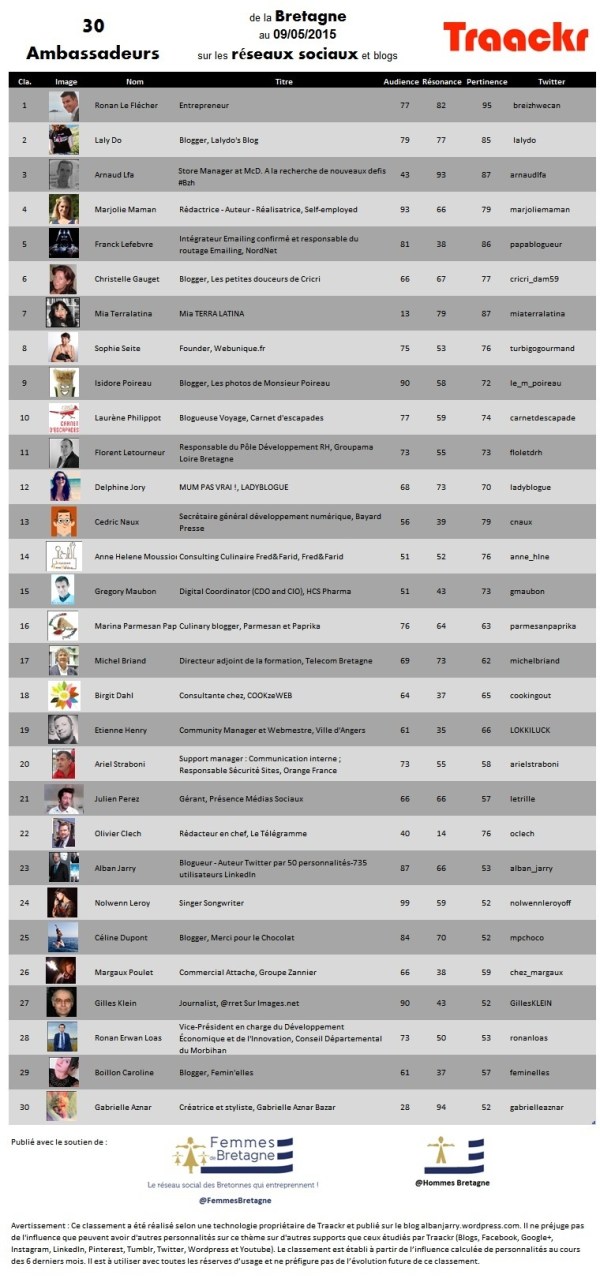 Avec les soutiens de « Femmes de Bretagne » et d’ « Hommes de Bretagne », nous vous proposons, avec Traackr, un classement des 30 ambassadeurs, au 9 mai 2015, ayant le plus d’impact quand ils communiquent sur le thème de la Bretagne sur les réseaux sociaux en France.