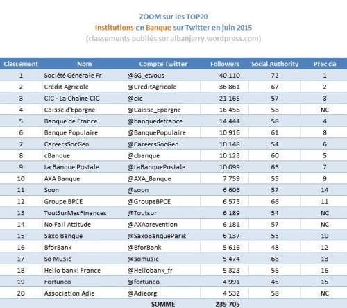 Le classement des institutions en banque continue de progresser, les 20 premiers comptes comptabilisent maintenant 235 000 followers contre 187 000 il y a 6 mois.