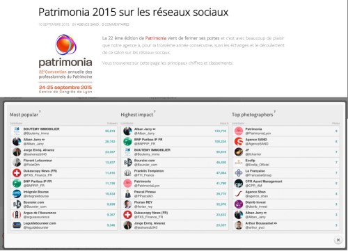 L’agence Sand propose une analyse du salon Patrimonia sur son site. Les plus actifs, ceux qui ont fait le plus de RT, … et la liste de ceux ayant eu le plus d’impact.