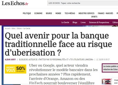 Pour lire la totalité du texte, cliquez sur le lien http://www.lesechos.fr/idees-debats/cercle/cercle-140102-quel-avenir-pour-la-banque-traditionnelle-face-au-risque-duberisation-1159895.php#xtor=CS1-33