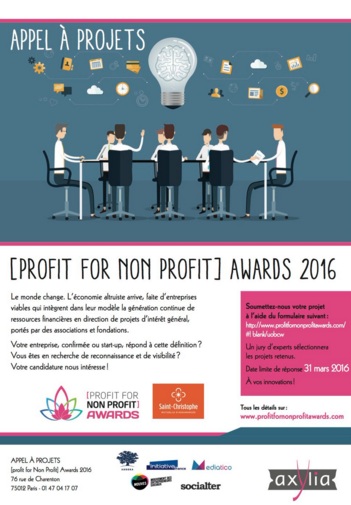 L’appel à projets pour les prochains [Profit for Non Profit] Awards vient d’être lancé. Il est ouvert jusqu’au 31 mars 2016 et ouvert à toutes les entreprises et projets altruistes. Je suis très heureux de faire partie une nouvelle fois du jury :