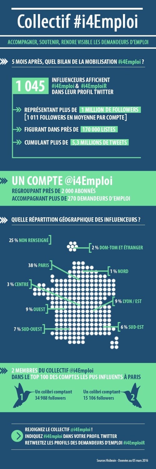 1000 twittos influents cumulant plus de 1 million de followers affichent le hashtag #i4Emploi dans leurs biographies Twitter, c’est le constat que nous pouvons faire dans cette nouvelle infographie. Engagés pour offrir de la visibilité à des talents en recherche d’emplois, ces « colibris » sont les maillons d’une chaine qui s’est développée très rapidement depuis 5 mois. Altruistes, ils ont fait du « Don de RT » une force pour aider d’autres twittos et faire le lien avec des recruteurs. Tous pensent qu’à leur niveau ils pouvent peut être faire quelque chose pour lutter contre le chômage.