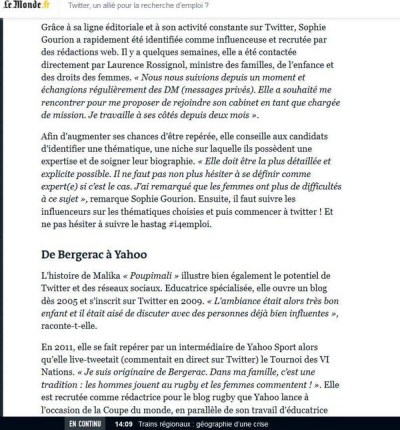 Gaëlle Picut a écrit un article pour Le Monde sur le rôle de Twitter dans la recherche d’emploi. Elle y interroge notamment Sophie Gourion et y parle de #i4emploi. A lire :