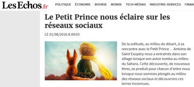 Inspirée du Petit Prince d’Antoine de Saint Exupéry voici ma dernière tribune réalisée pour le Cercle Les Echos. De nos jours, l’univers du Petit Prince est toujours aussi proche de ce que nous vivons.