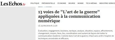 Pour lire la suite de l’article : http://www.lesechos.fr/idees-debats/cercle/cercle-160708-13-voies-de-lart-de-la-guerre-appliquees-a-la-communication-numerique-2029398.php