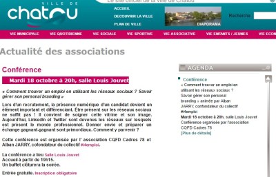 Les réseaux sociaux servent aussi à trouver une emploi en y montrant ses compétences. Le 18/10, CQFD CADRES78 organise une conférence gratuite sur l’emploi et les réseaux sociaux à partir de 19h30 à Chatou (78). La deuxième partie parlera de i4emploi. Pour s’inscrire et y assister :
