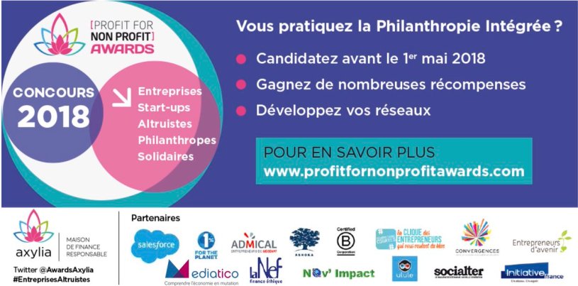 L’appel à projets pour les prochains [Profit for Non Profit] Awards vient d’être lancé. Il est ouvert jusqu’au 1er mai 2018 et ouvert à toutes les entreprises et projets altruistes. Je suis très heureux de faire partie une nouvelle fois du jury avec Henri Vannerot, Vulfran de Richoufftz, Louisa Renoux, Véronique di Benedetto, Ismael Le Mouel, Stéphane Toullieux, Béatrice de Durfort, Julia Fernandez, Sylvaine Parriaux et Vincent Auriac :