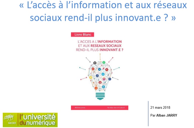 Uncategorized Conférence «Information et #RéseauxSociaux rendent-il plus innovant ?» (@medef) #Unum18 #612Rencontres #TransfoNum Date: 21 mars 2018Author: Alban Jarry Voici le document présenté lors de l’université numérique du Medef : _________________________________________________________ Livre Blanc: _________________________________________________________ Partager : Partager sur X(ouvre dans une nouvelle fenêtre) X Partager sur LinkedIn(ouvre dans une nouvelle fenêtre) LinkedIn Partager sur Pinterest(ouvre dans une nouvelle fenêtre) Pinterest Partager sur Facebook(ouvre dans une nouvelle fenêtre) Facebook Envoyer un lien par e-mail à un ami(ouvre dans une nouvelle fenêtre) E-mail Imprimer(ouvre dans une nouvelle fenêtre) Imprimer J’aime chargement…