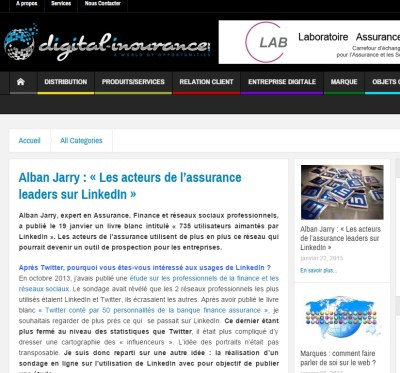 Alban Jarry, expert en Assurance, Finance et réseaux sociaux professionnels, a publié le 19 janvier un livre blanc intitulé « 735 utilisateurs aimantés par LinkedIn ». Les acteurs de l’assurance utilisent de plus en plus ce réseau qui pourrait devenir un outil de prospection pour les entreprises.